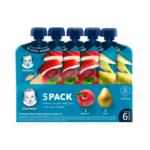 El 5 Pack Gerber Pouch es un conjunto de 5 bolsitas de comida para bebés, cada una con un peso neto de 100 gramos. Estas bolsitas contienen una variedad de alimentos y sabores para bebés y niños pequeños.