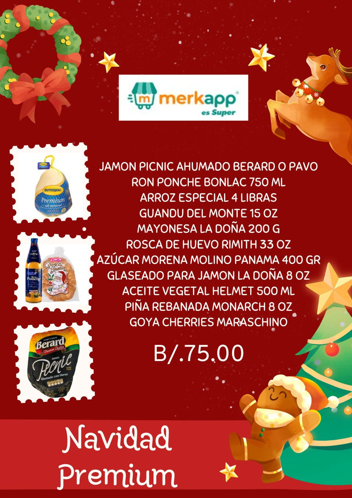 Jamón Picnic Ahumado Berard 3.63 kg, Ron Ponche Bonlac 750 ml, Arroz Especial 4 lbs, Guandu del Monte 15 oz, Mayonesa La Doña 200 g, Rosca de Huevo Rimith 33 oz, Azúcar Morena 400 gr, Glaseado para Jamón 8z, Aceite Vegetal Helmet 500 ml, Piña rebanada Monarch 8 oz, Goya Cherries Maraschino.