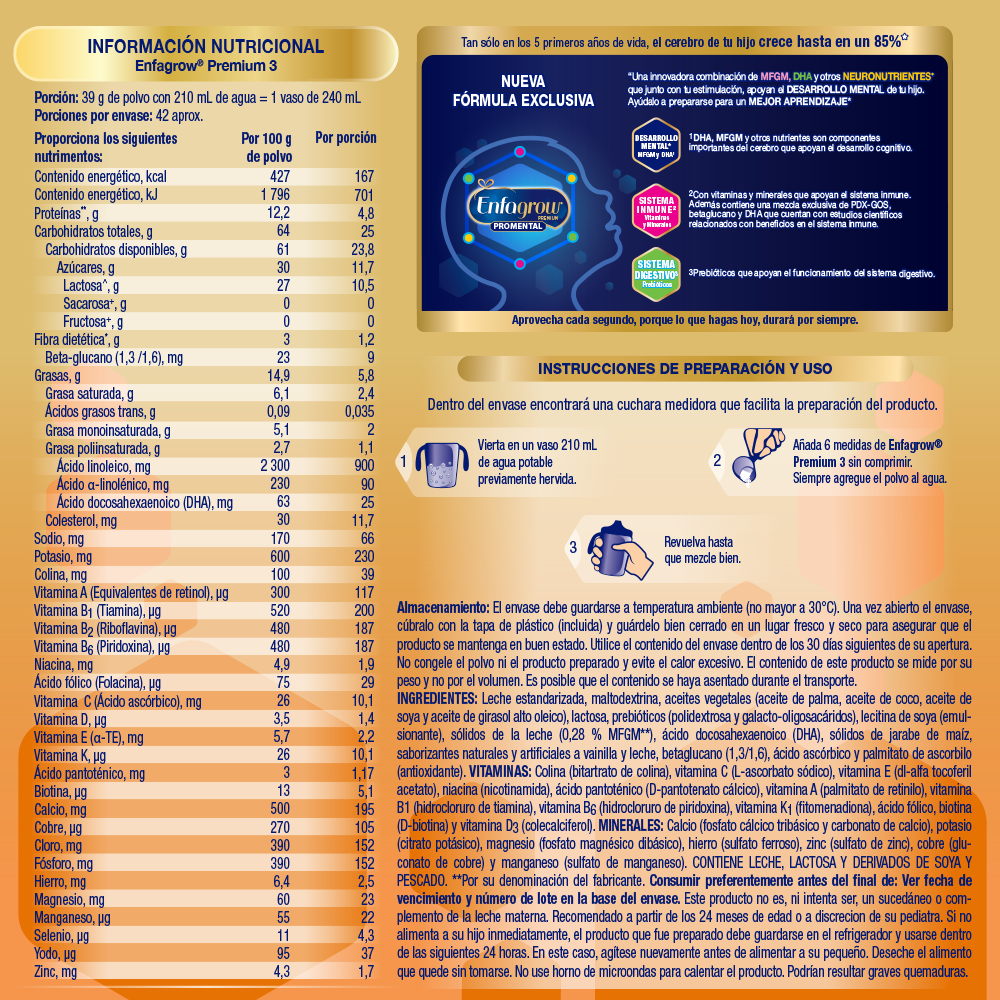 La fórmula de Enfagrow Premium Etapa 3 contiene DHA, un ácido graso omega-3 que se encuentra naturalmente en el cerebro y los ojos y que ayuda en el desarrollo del cerebro y la visión. También contiene hierro, zinc y vitaminas C y E, que ayudan a apoyar el sistema inmunológico del niño.