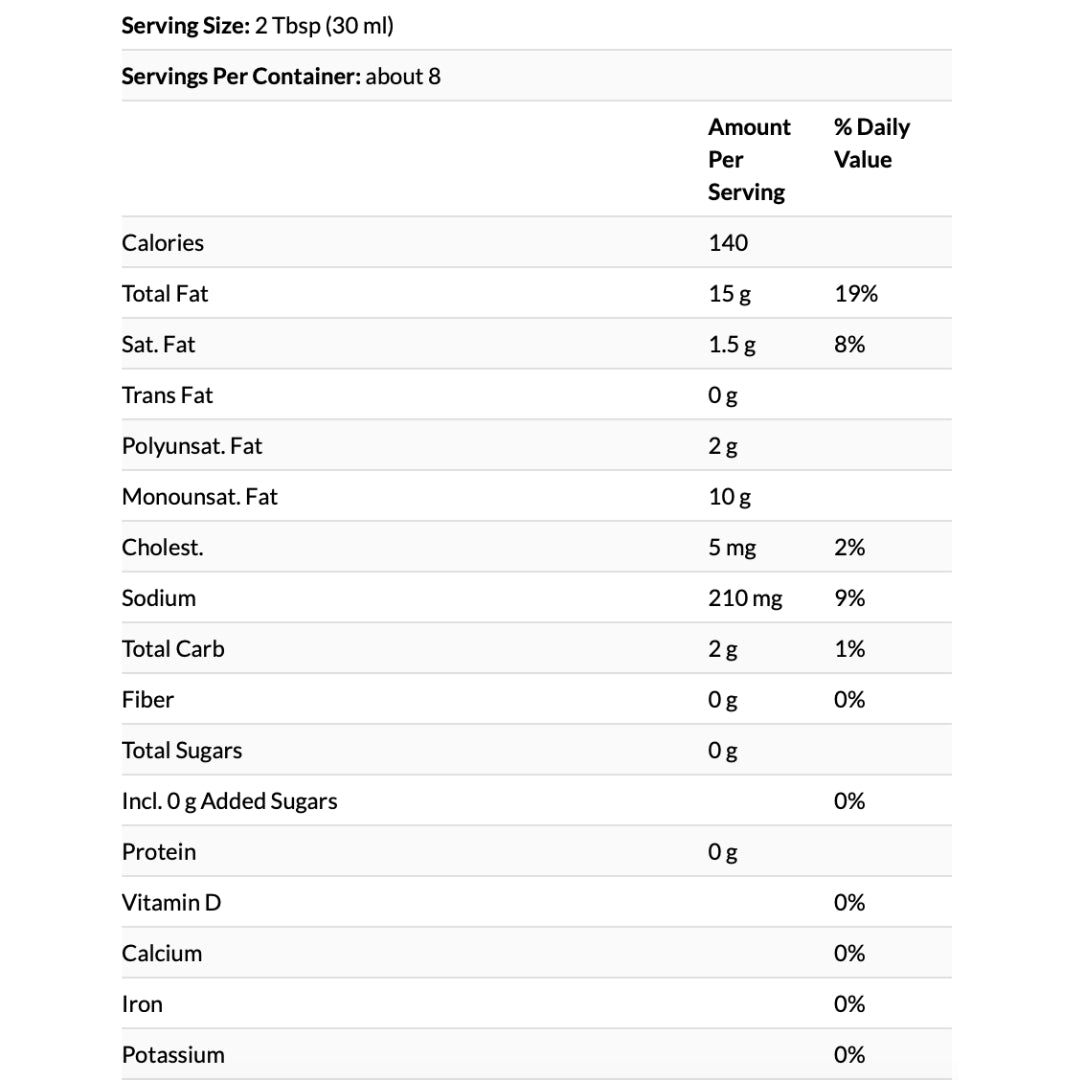 Hecho con aceite de aguacate tiene un aderezo para gobernarlos a todos, hecho sin gluten, lácteos, soya o aceite de canola. Ensaladas y wraps, regocíjense: esta marinada reina con huevos orgánicos, vinagre de sidra de manzana orgánico y hierbas y especias orgánicas. Este aderezo es perfecto para rociar sobre ensaladas de lechuga romana o chisporrotear sobre pollo.
