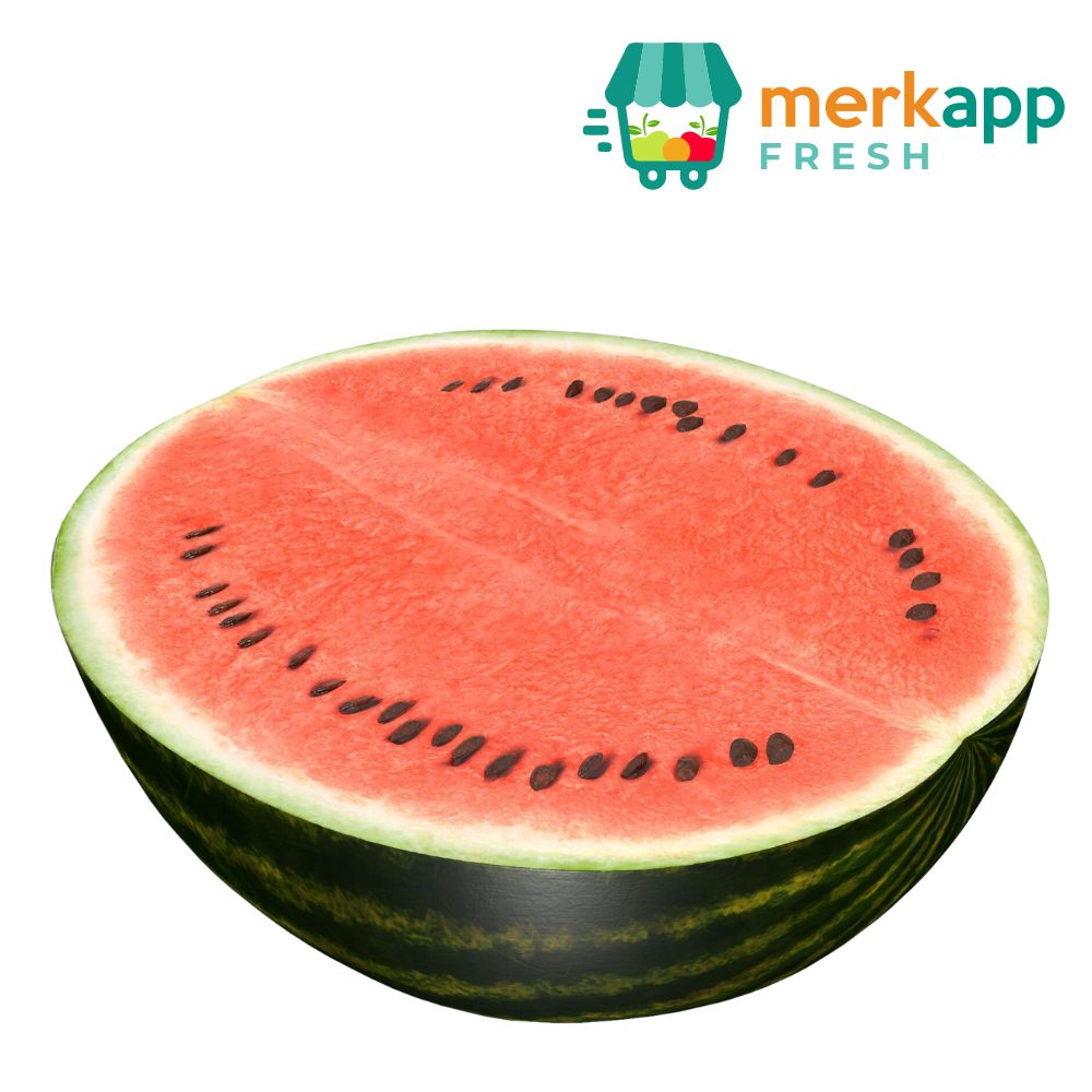 Contenido: Corte de mitad (5 libras aprox) de Sandía Nacional de Merkapp Fresh. Producto cortado al instante de ser despachado.